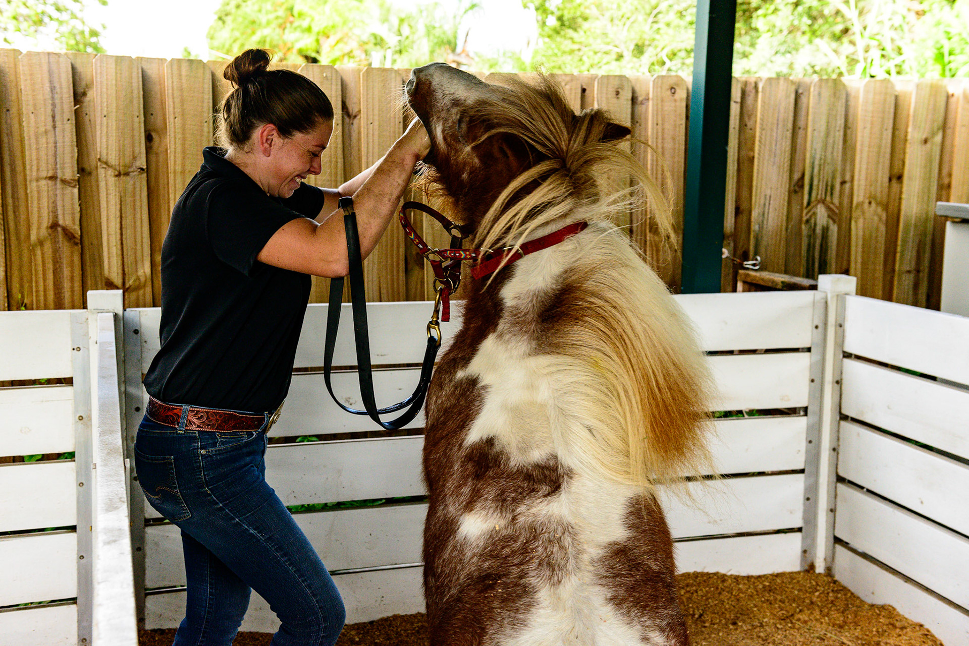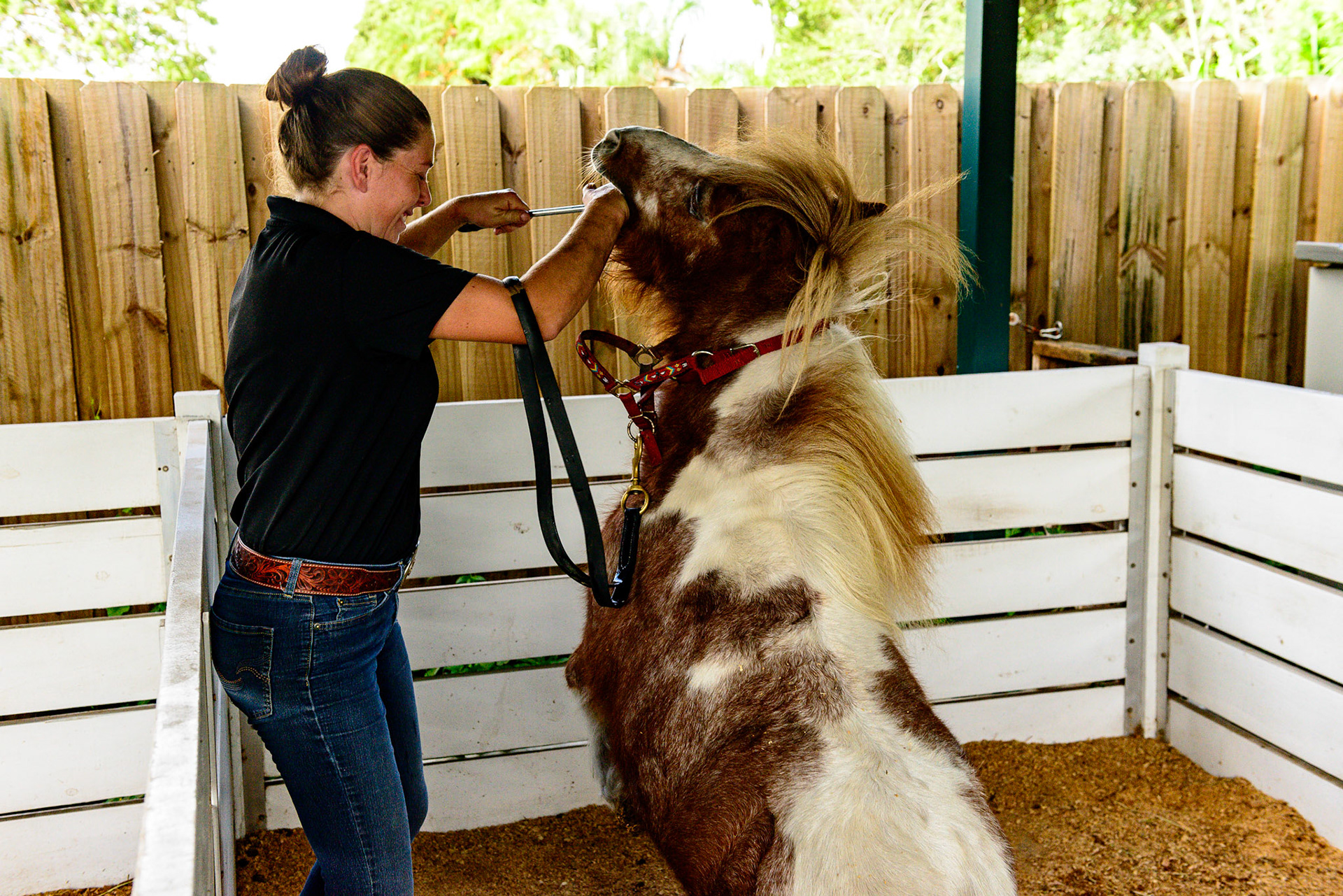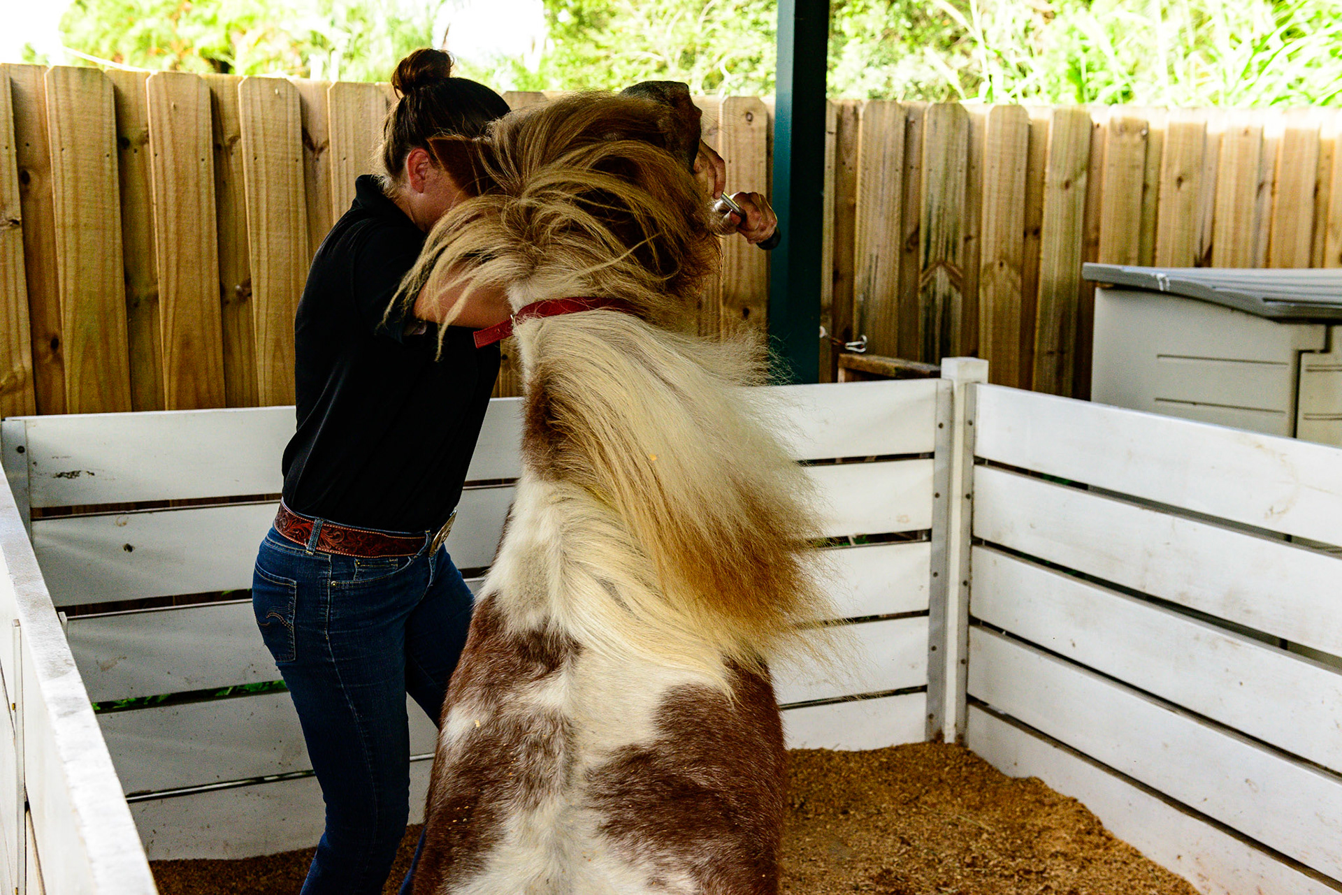 This horse likes to rais her head high to avoid everything in her mouth including the float. If they keep it high or do it repeatedly, raise the blade up to their eye level. The horse will quickly think that she can't get away from this very tall person and the head will lower allowing you to work. You may need to do this several times, but most horses respond after the first time you use this trick.