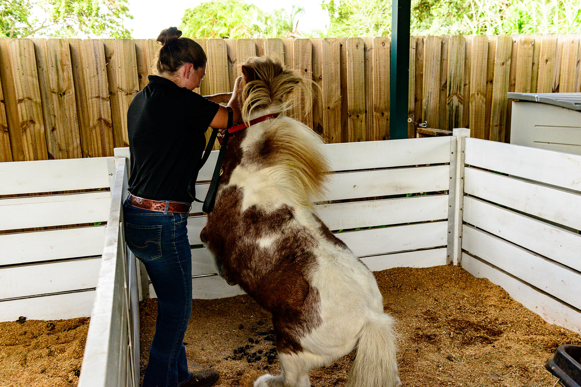 3/7 Melissa works on a difficult horse. A very confident choleric horse that doesn't connect well with people. He is starting to tilt the head which is often the escalation to the next level. Notice how Melissa remains focused on the task and ignores the antics of the horse. The fingers of the left hand firmly squeezes the nostril as a way to let him know that his actions are not acceptable. This is all she does because any other actions, such as anything verbal, would be rewarding his escalating bad behavior. Never reward bad behavior.